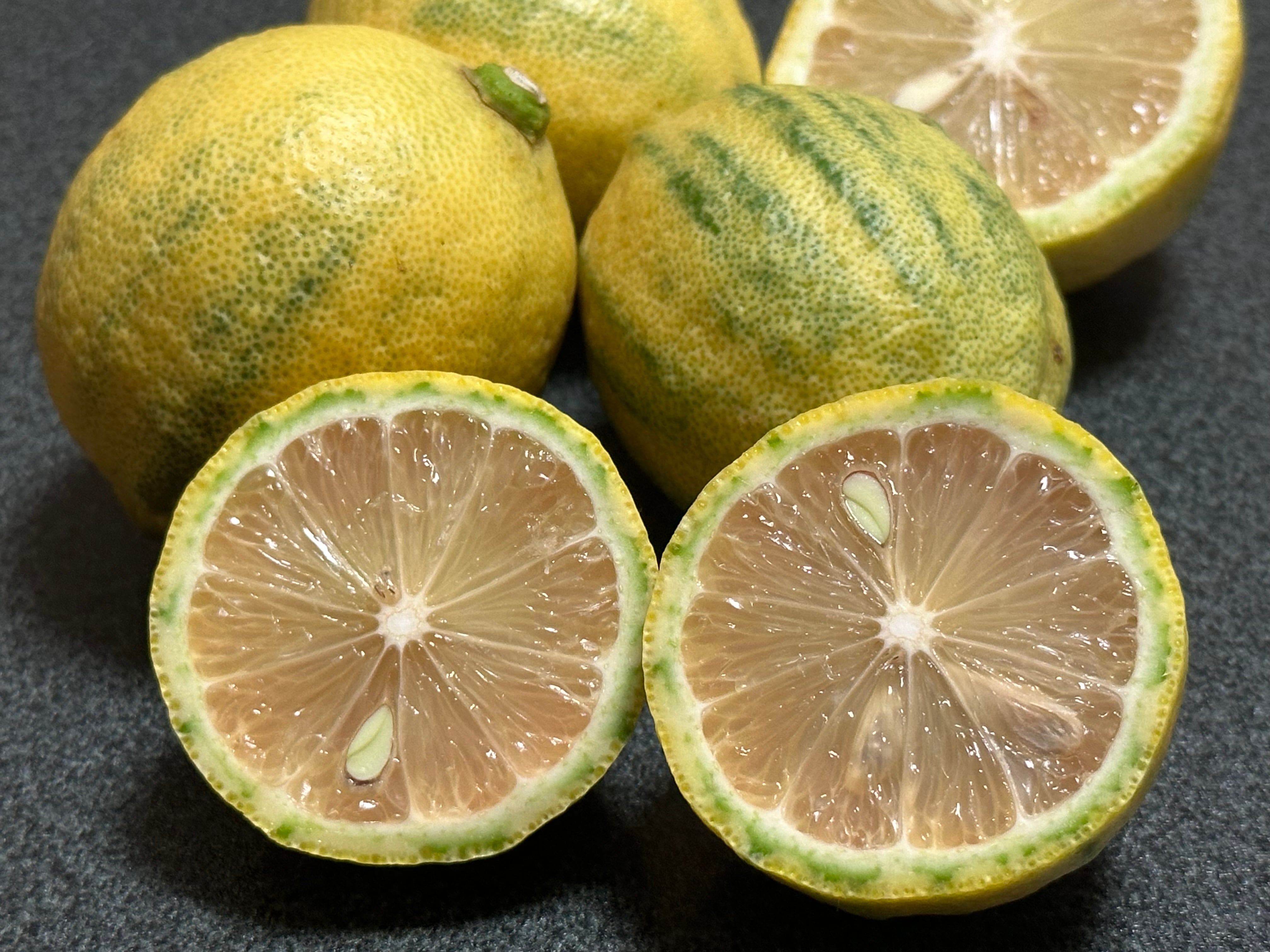 果肉はピンク色で、果皮には緑色のストライプ模様が現れる?個性的なレモン。しっかりした酸味がうれしい。